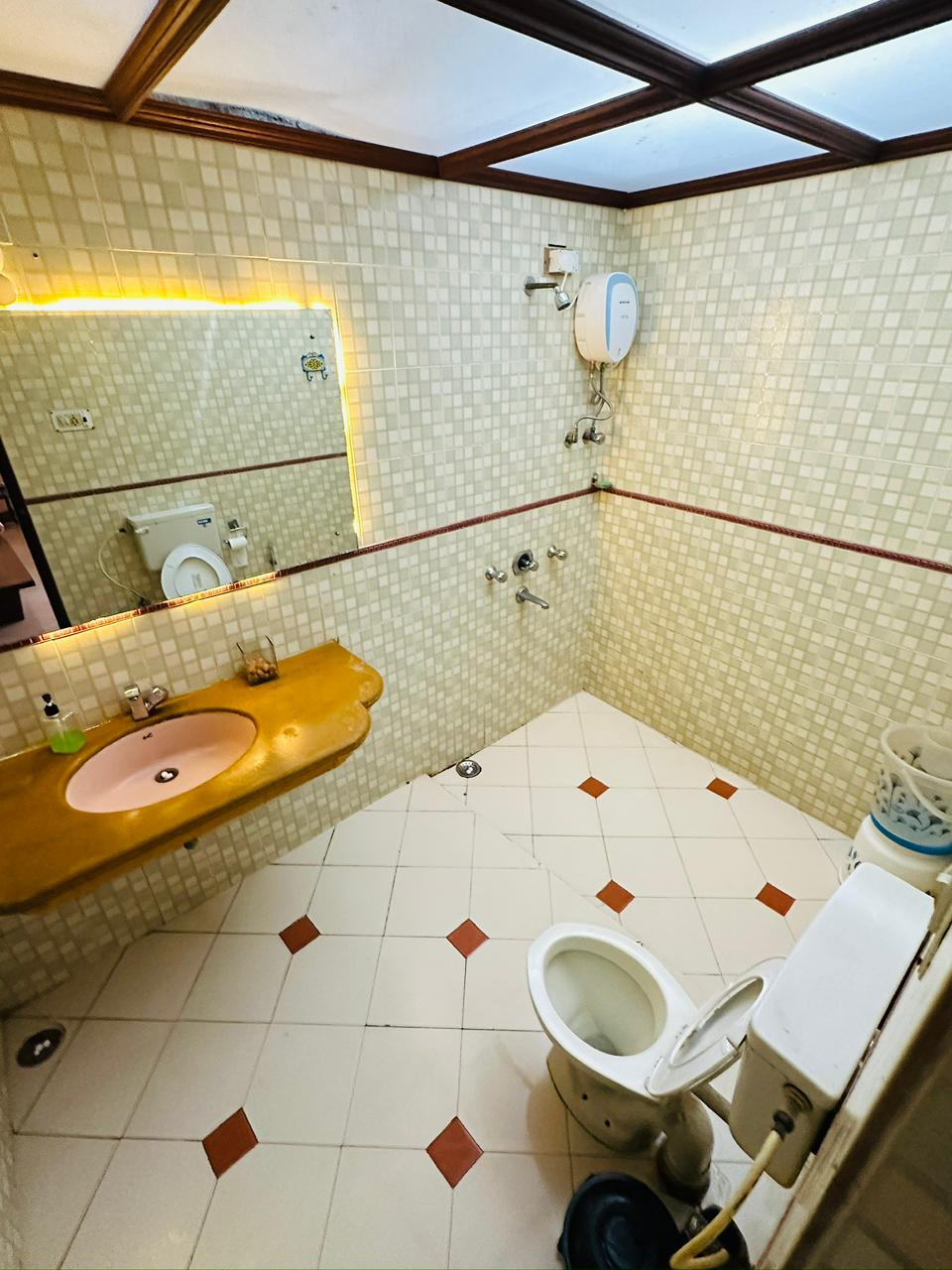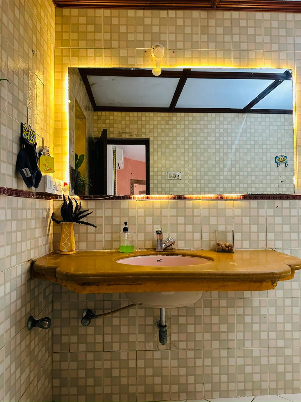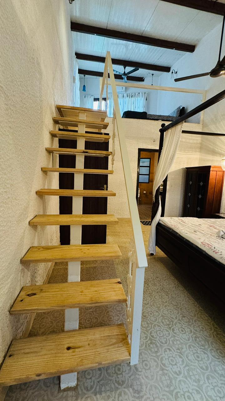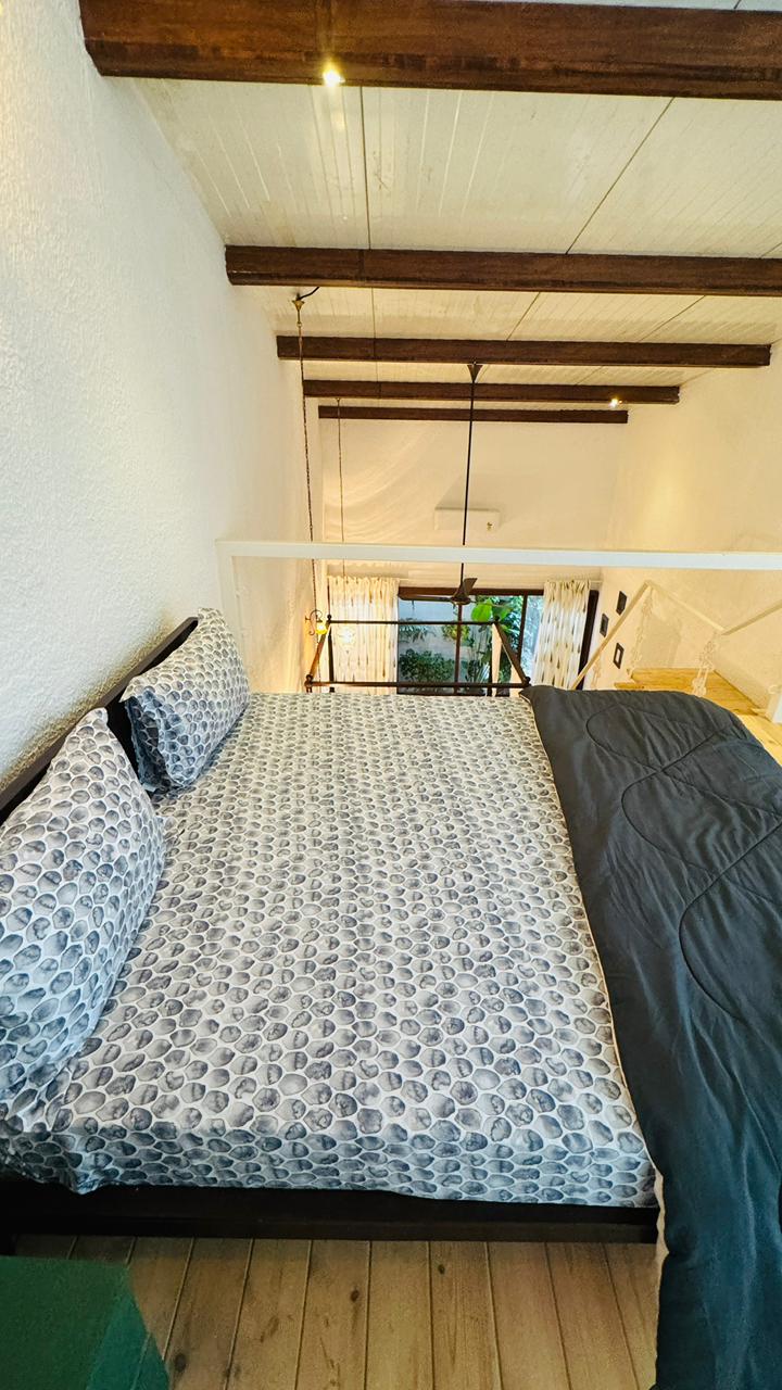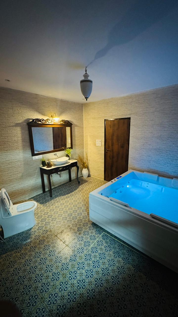 The master bedroom offers complete comfort and privacy with a spacious king-size bed and soothing interiors. Large windows provide a refreshing garden view and ample natural light. An attached private washroom inside the room ensures convenience, making it ideal for a peaceful and relaxing stay.